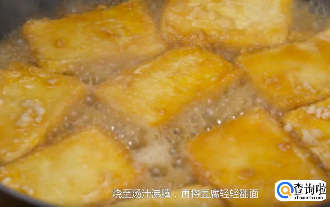 加盐、白糖和少许高汤,烧至汤汁沸腾,再将豆腐轻轻翻面,裹匀汤汁。