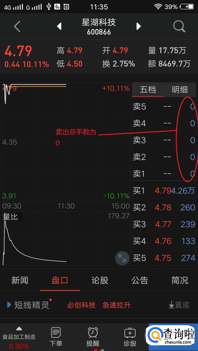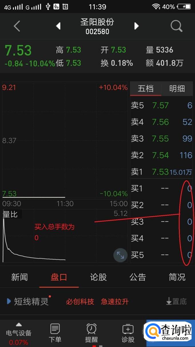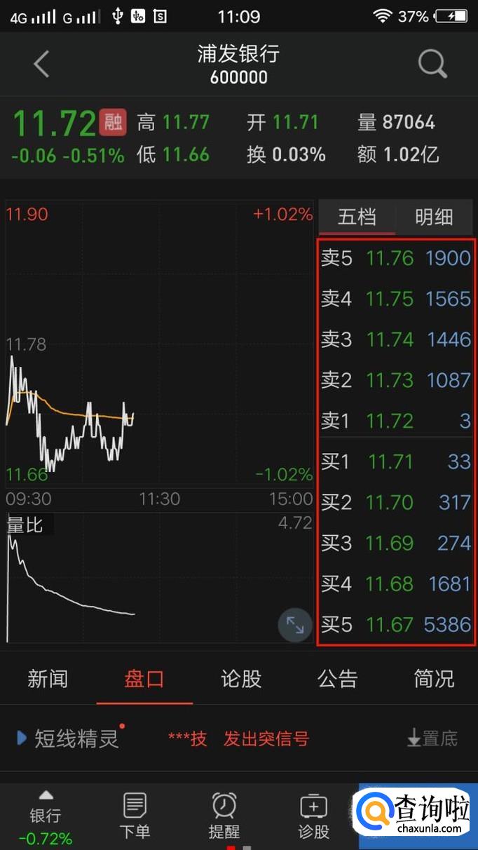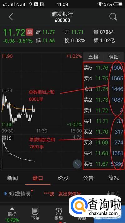 我们取前5档委买和委卖的数值。可以计算委买总手数为7691,委卖总手数为6001。则根据公式,可以得出此时,该股票的委比为(7691-6001)/(7691+6001)×100%=12.34%