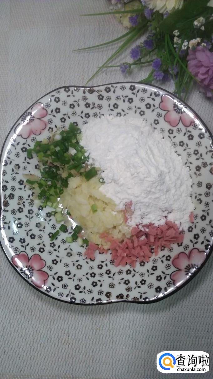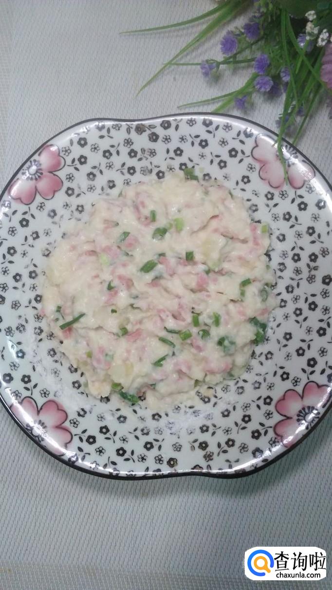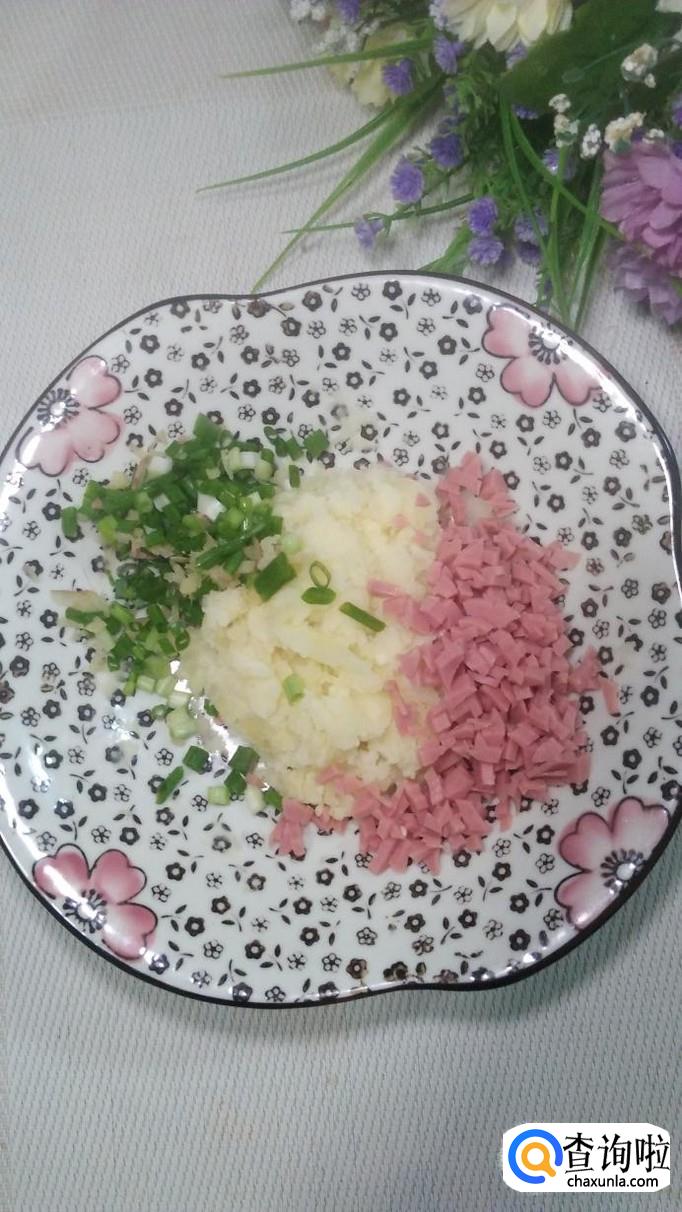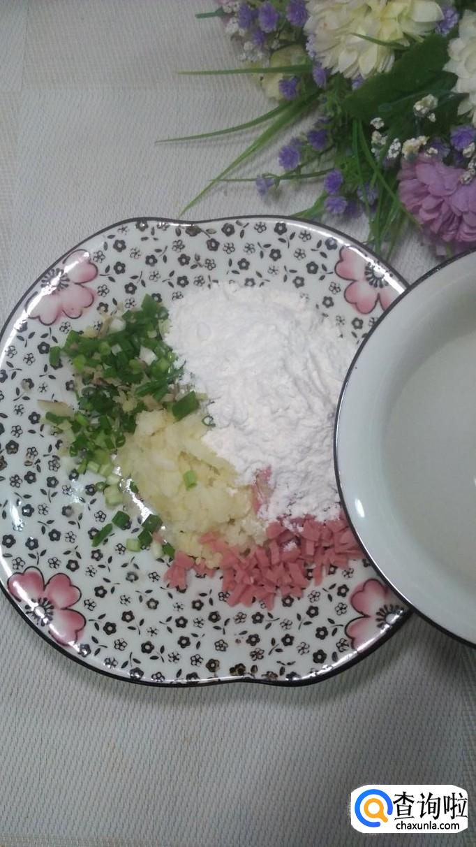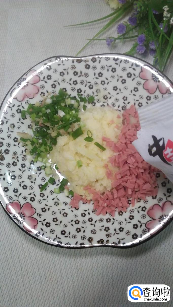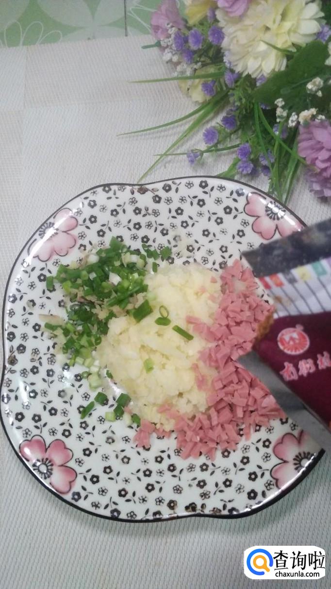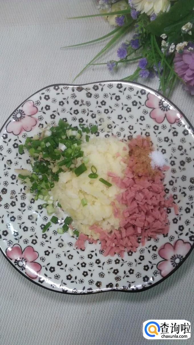 将蒸好的土豆,用勺子压成泥,然后将小葱,姜,蒜,火腿肠切碎,和土豆放在一起。放入适量盐,鸡精,五香粉。