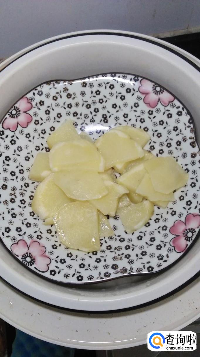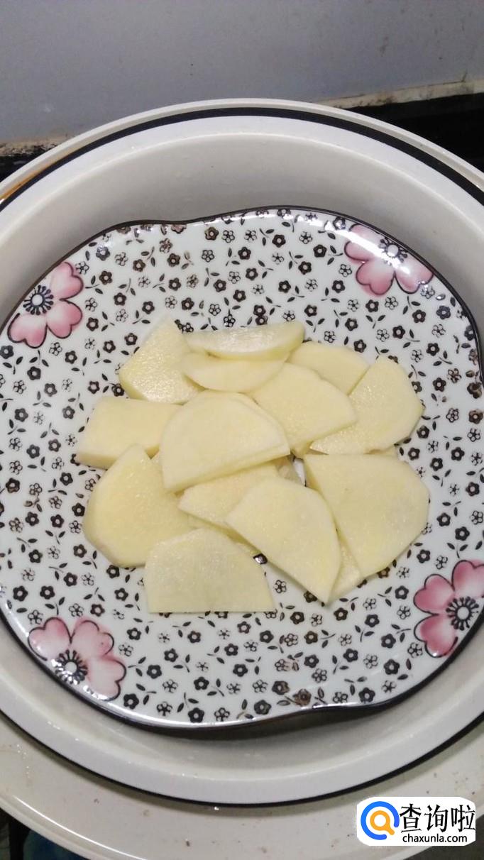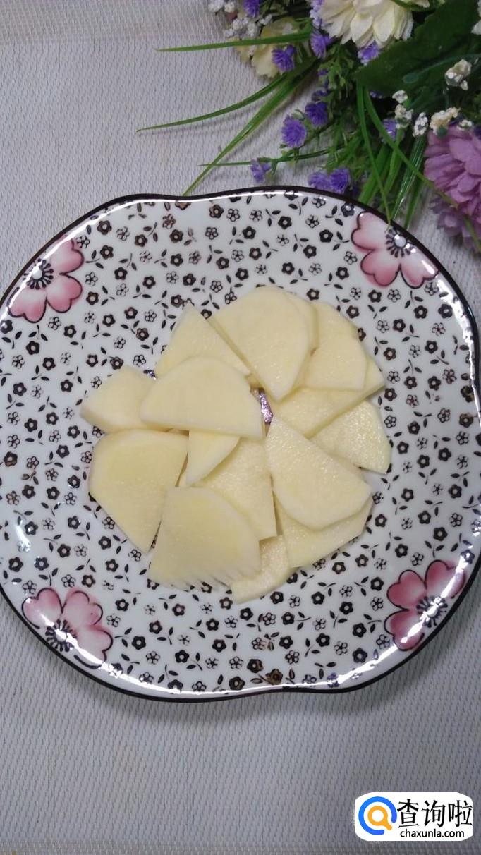 准备一个土豆洗净后,去皮,切成片儿,不用洗去淀粉,土豆最好选用新鲜的土豆,发芽的土豆有毒,千万不要选用。