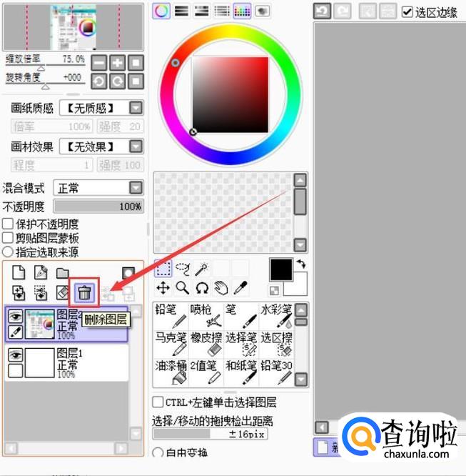 第二排位置第四个垃圾桶图标就是删除图层命令,点按一下就会选中当前选中的图层。