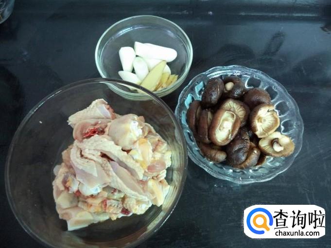 准备适量的香菇,洗净,葱姜蒜适量,洗净备用,一只鸡,处理干净,砍成小块