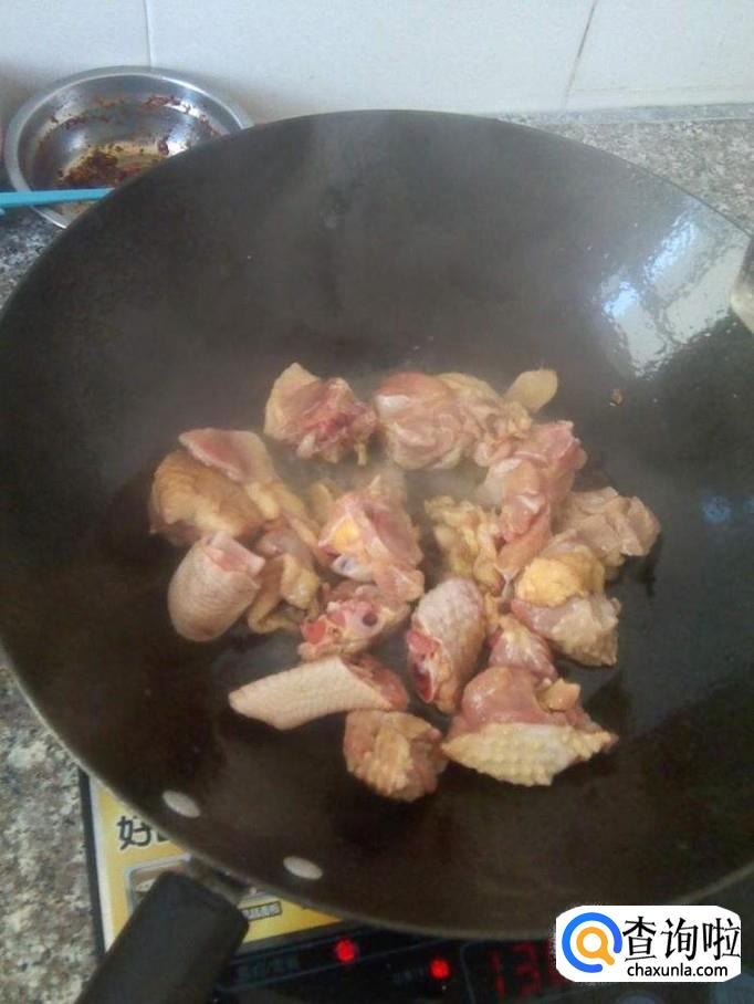 锅烧热,然后倒入鸡肉,翻炒至鸡肉变得皮肉紧致,加入料酒,老抽,香油适量,爆炒