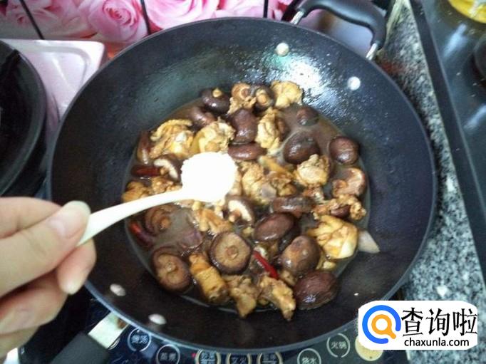 加入香菇,炖30分钟左右,加盐适量,搅拌均匀,起锅