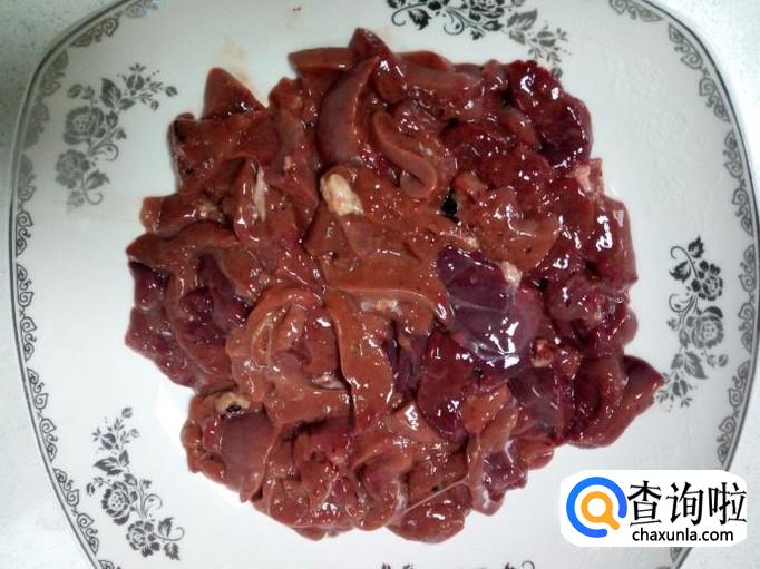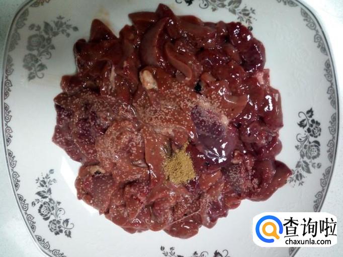 鸡肝收拾清洗干净,控干水分,切成块。放入五香粉,料酒,少许盐,腌制15分钟。