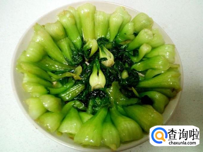 把炒好的油菜摆放在盘中。