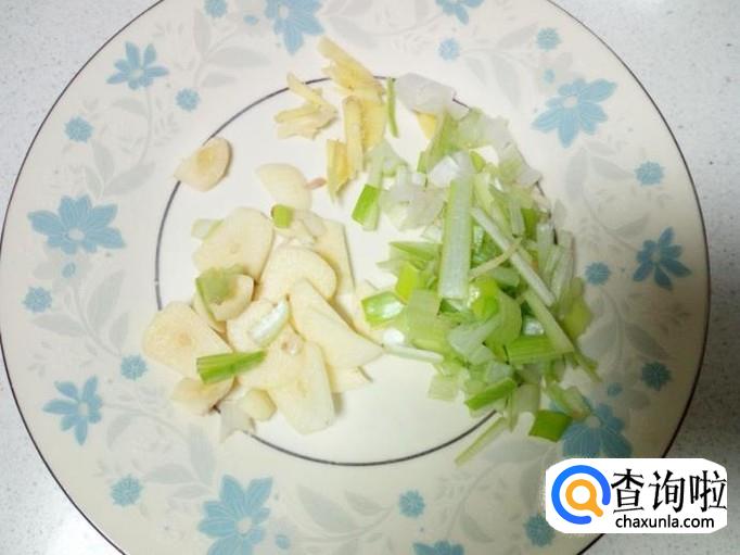 另用一个碗,放入一小匙儿淀粉,兑水,勾成芡汁。切好葱,姜,蒜,备用。
