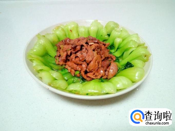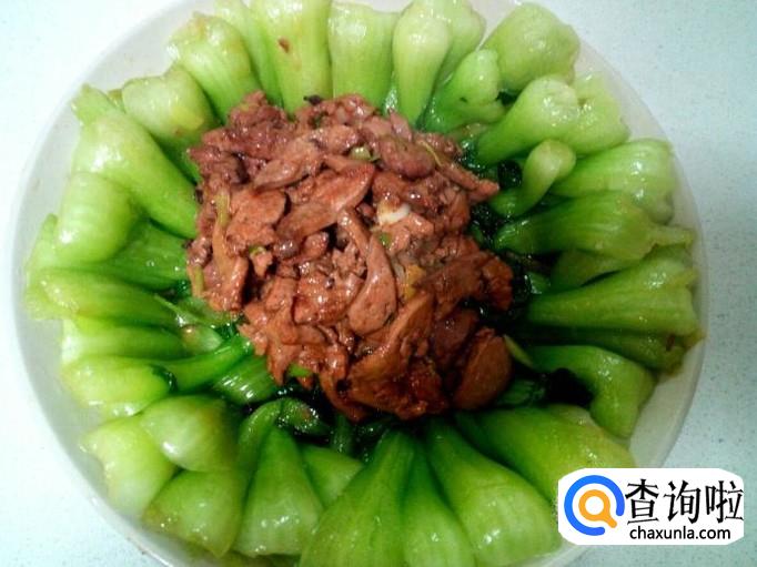 把炒好的鸡肝,放入摆放油菜的盘中即可。