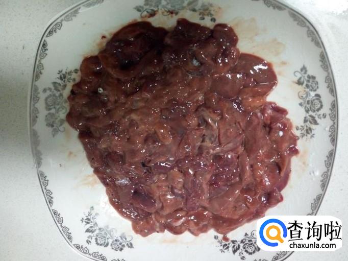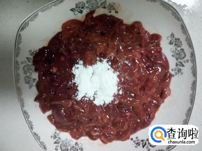 把腌制好的鸡肝,放入适量的淀粉,用手抓匀。