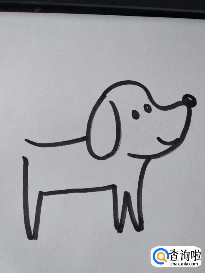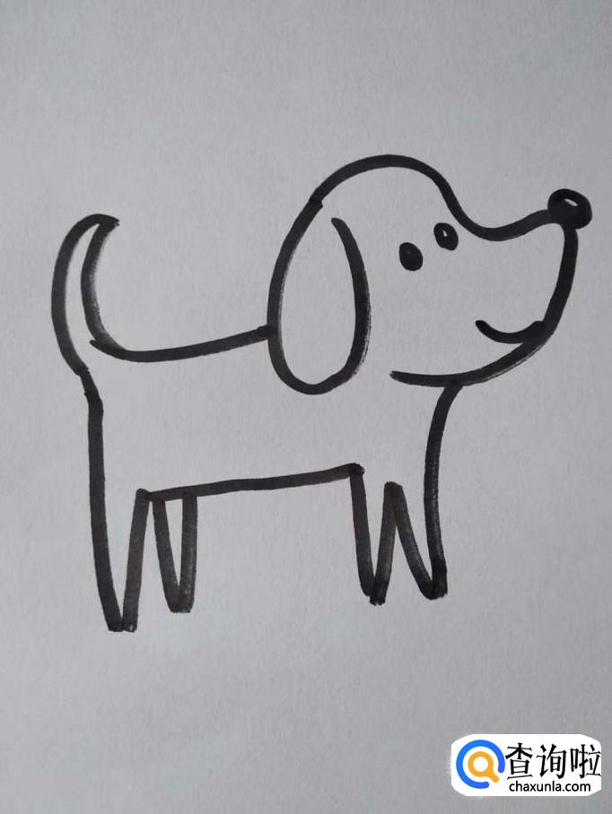 最后画出小狗的尾巴。小狗的尾巴稍短一些,尾巴是向上弯曲的,末端很细。以上六个步骤就画出的小狗的简笔画,是不是很简单?如果有兴趣,赶快动笔试试吧!