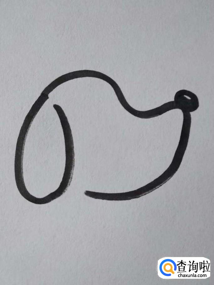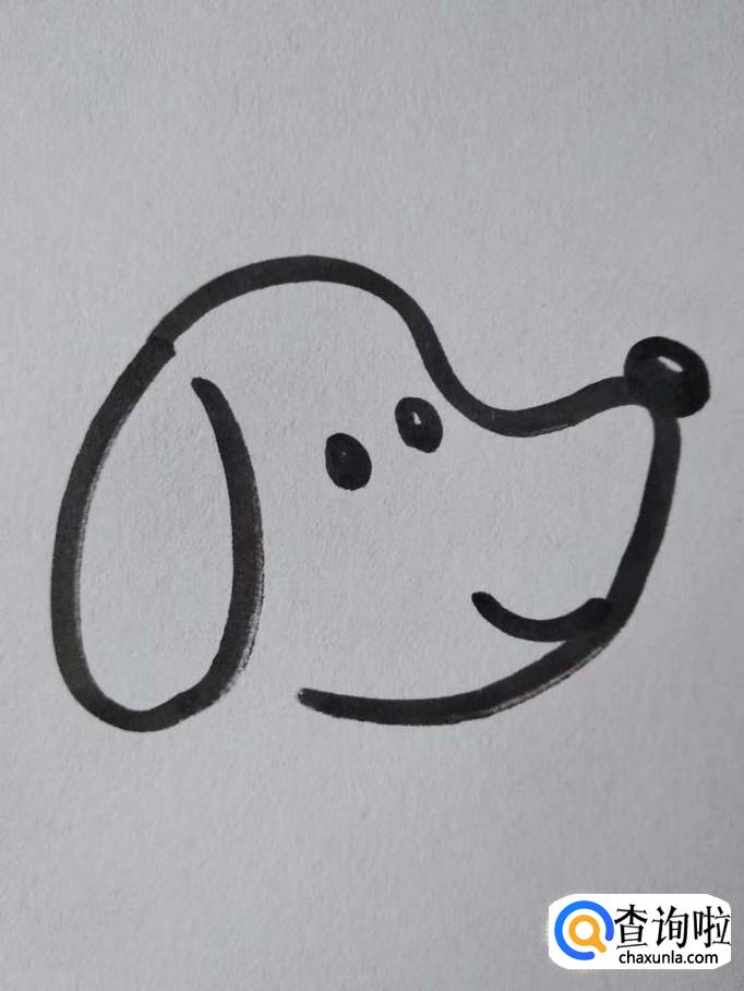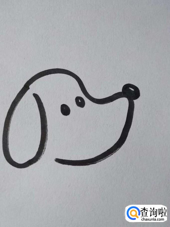 先画出小狗的头部轮廓,画头部轮廓不仅要线条流畅,该弯曲的弯曲,还要一气呵成。头部上半部分较平缓,鼻子的部位是往外凸的,鼻子下方是往回收的。头部鼻子下方的轮廓是一段圆弧形的。