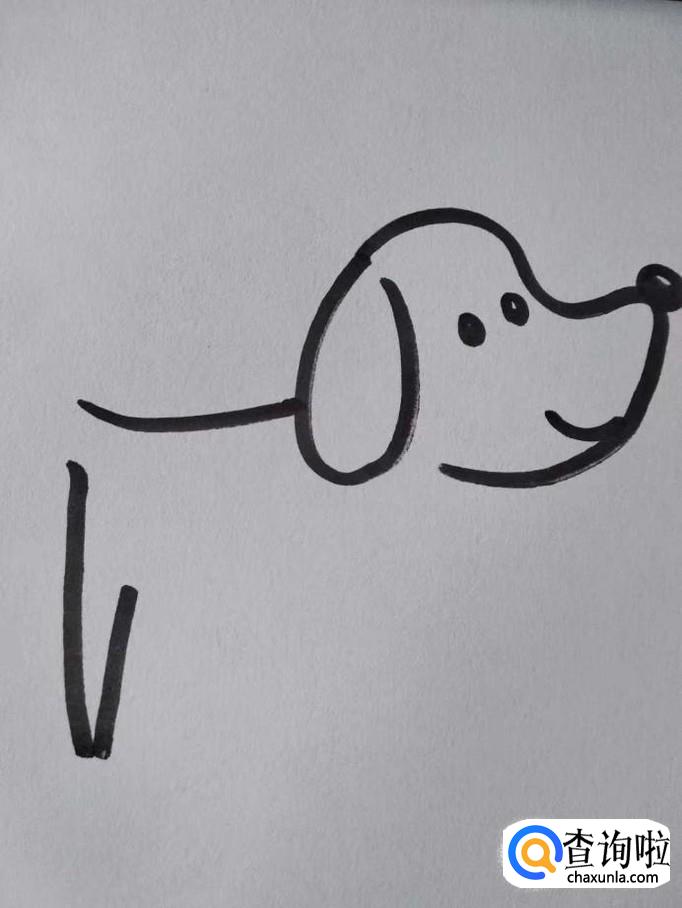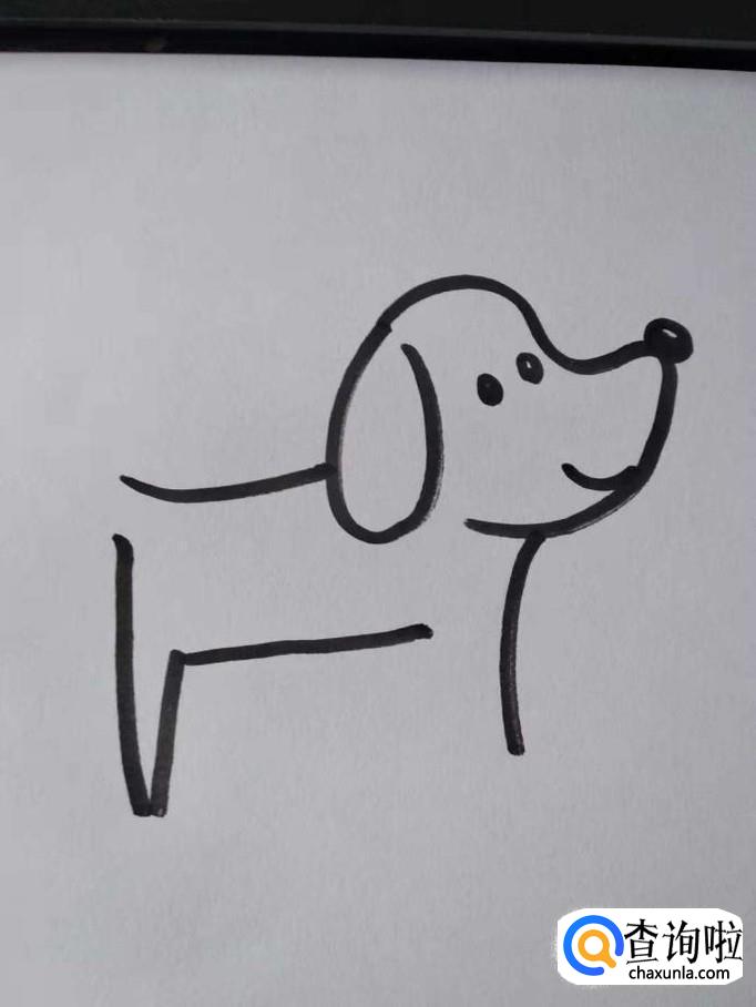 画出小狗的一只后腿,因为是简笔画,小狗的腿的末端是三角形的。腿的线条是左侧竖直一些,右侧稍斜向下收。在背部和这腿腿之间流出尾巴的位置。画出腹部下轮廓线。在小狗下巴的下端,画出前腿的右侧轮廓线。