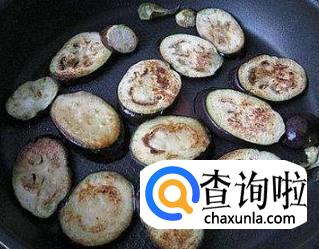 锅中放少许食用油,将茄子片放入锅中,中火煎至两面略呈黄色、半透明,并且茄子发软,就可以盛入盘中待用。