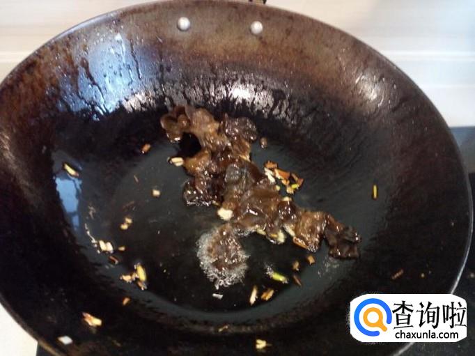 锅内放入油加热,油热后放入葱,姜,爆一下锅。放入木耳翻炒。