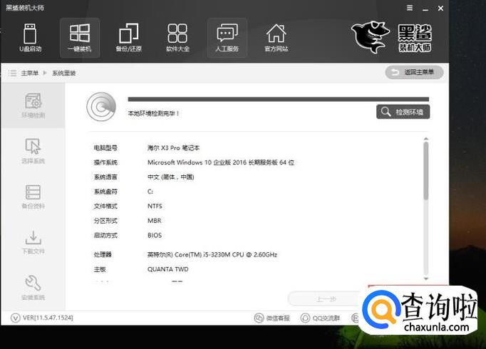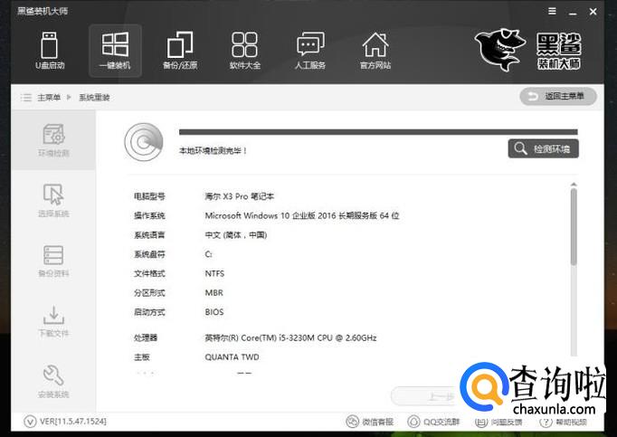 然后打开系统重装功能会自动检测本地环境检测完毕后会看到电脑的配置信息