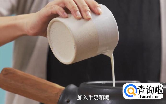 锅里再加入牛奶和糖,小火加热。一定要边加热边搅拌,不然糯米容易结块。