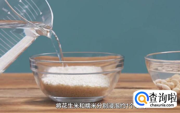先做花生酪,将花生米和糯米分别浸泡约1个小时,直到泡软为止。
