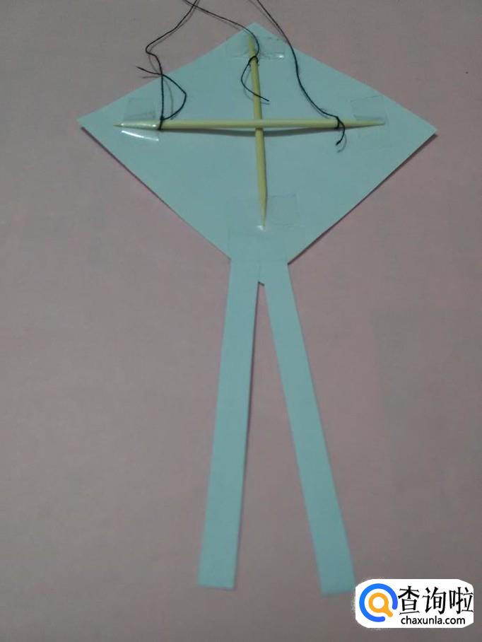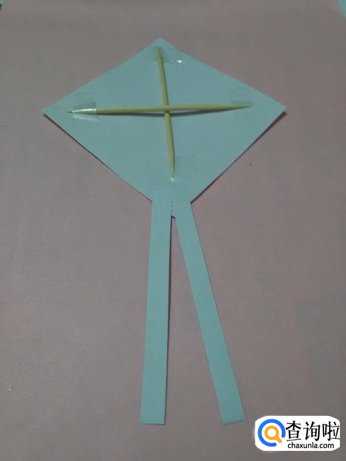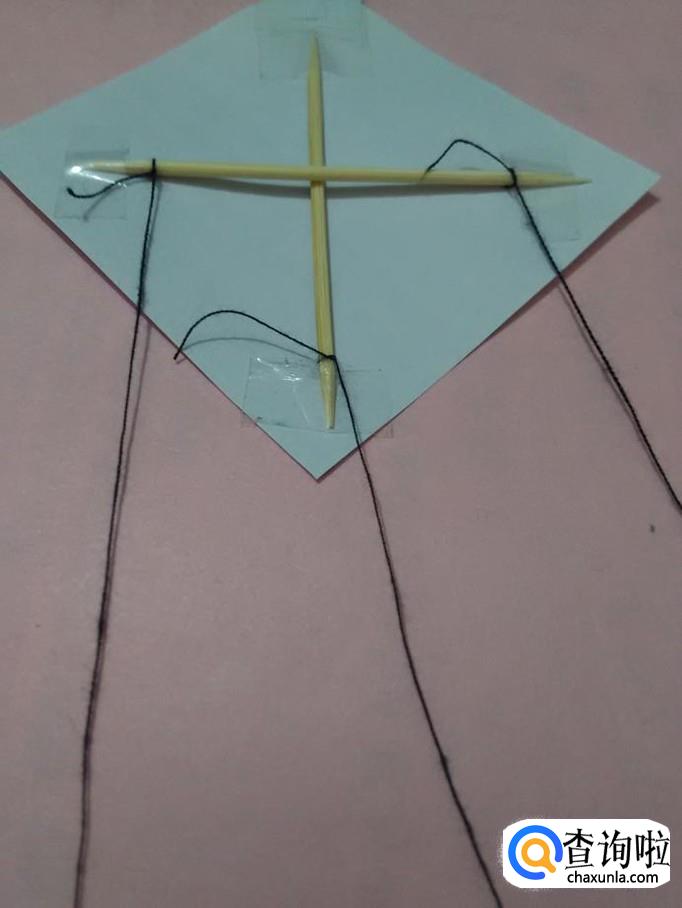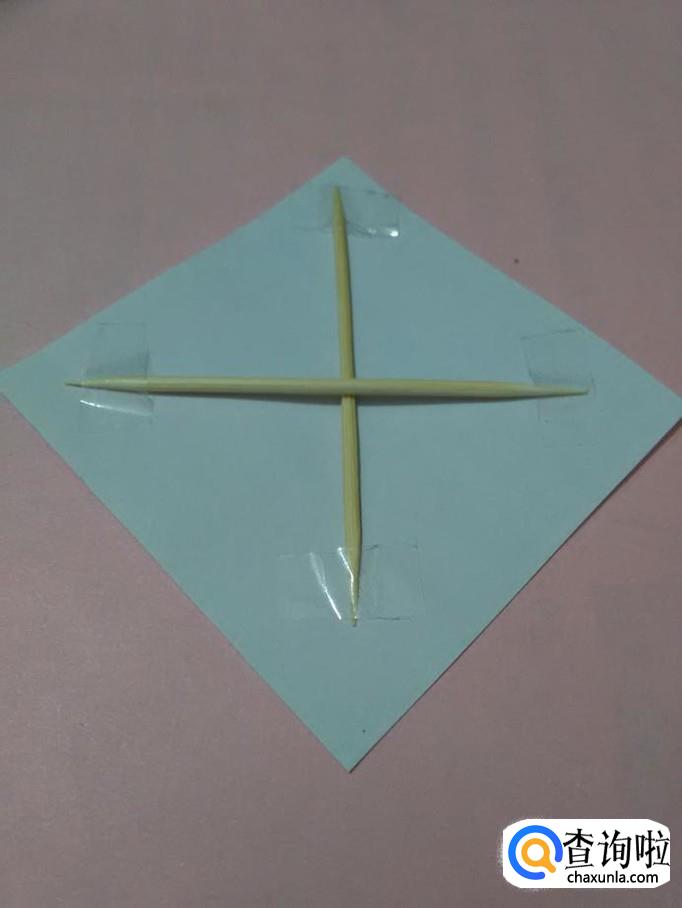 再把另一根竹签交叉地放在正方形对角线上,用胶带固定两端,风筝的骨架就做好了。