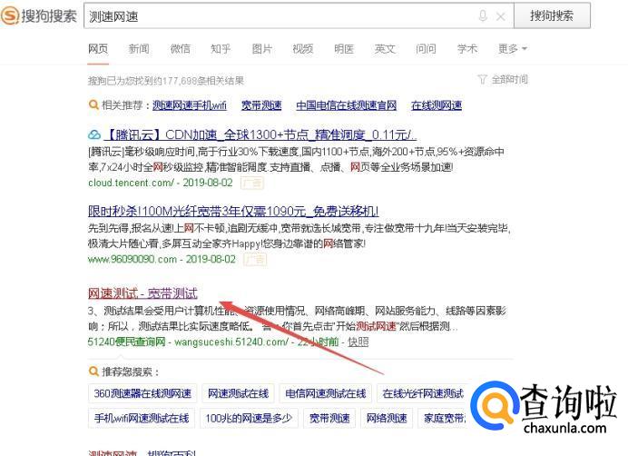 (1)首先,在搜狗高速浏览器中输入“测速网速”,然后再搜索界面中找到“网速测试-宽带测试”,点击进入。