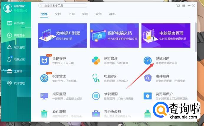 (1)打开电脑的安全类第三方软件,以“电脑管家”为例子,打开软件,在“工具箱”中,找到“测试网速”,点击测速。