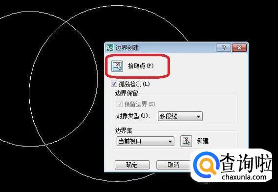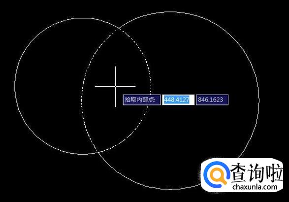 点击“拾取点”,然后我们点击两圆相交的区域内任意一点。