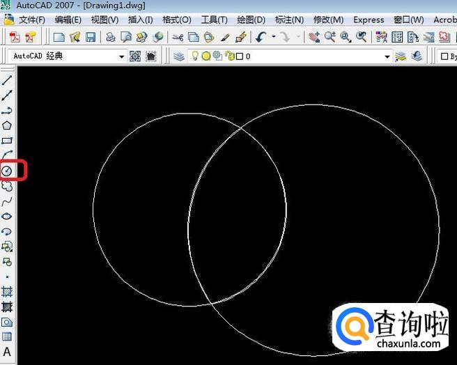 首先,打开CAD软件,我们创建两个简单图形来演示边界的创建。如图,是用工具栏中的“圆”命令绘制的两个相交圆。