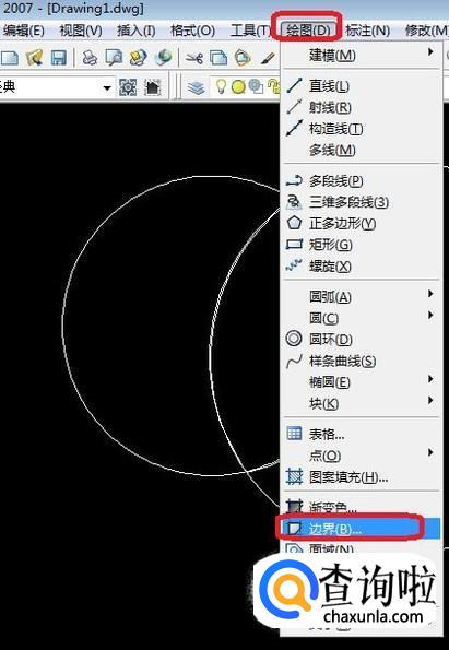 点击菜单栏“绘图”,并在下拉菜单中选择“边界”命令。