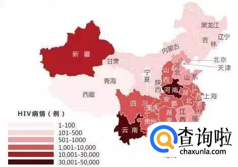 颜色从深到浅表示艾滋病疫情严重程度从高到低,由此可见云南、广西、河南、四川、新疆、广东的疫情泛滥。