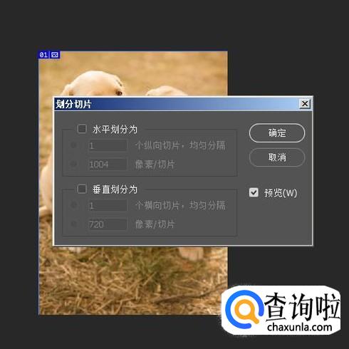 即弹出划分切片的对话框。那么,就按自己的实际要求来设置切片了,比如,你想把图片切成平均四等分的,那么,我们分别勾选:水平划分为与垂直划分为,并且设置参数为2;如图所示。再点确定。