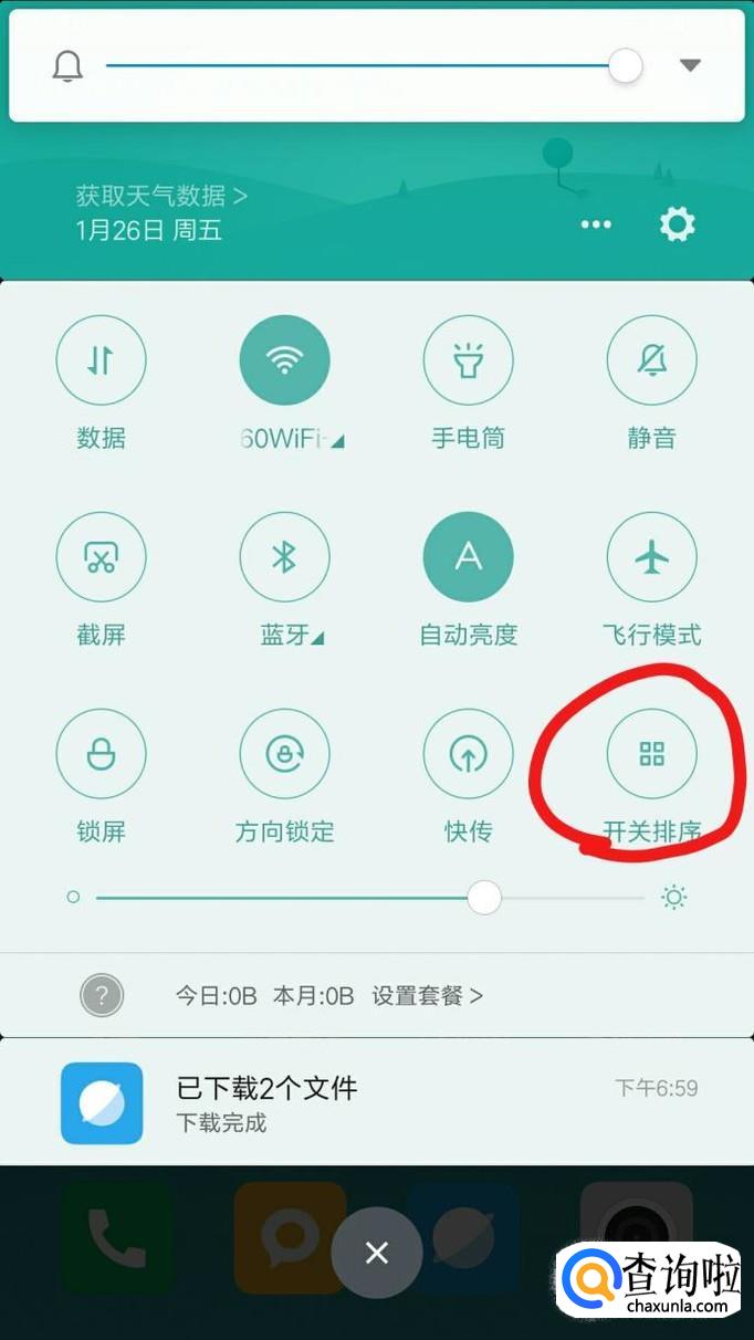 如果想要快速设置旋转屏幕,我们可以在手机桌面向下拉,看到功能排序。