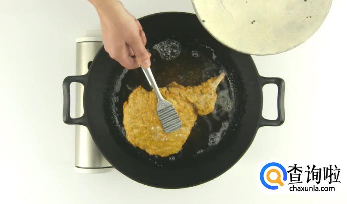 然后将火开到大火,使油温烧至95度,把猪排再次放入油锅中复炸,炸至两面金黄即可。