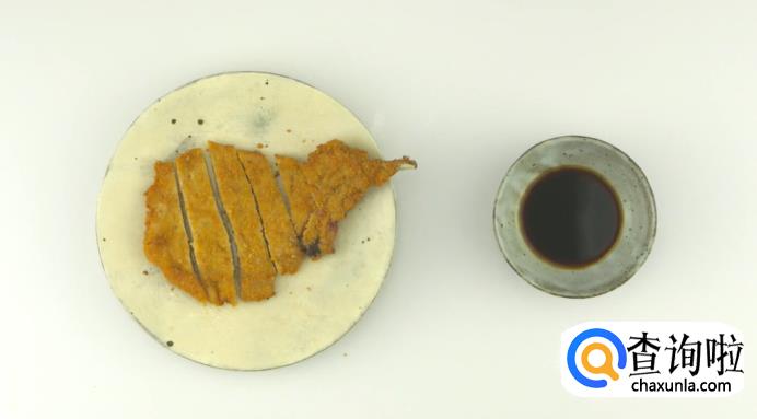 将炸好的猪排放入盘中,再搭配上辣酱油,风味更佳。