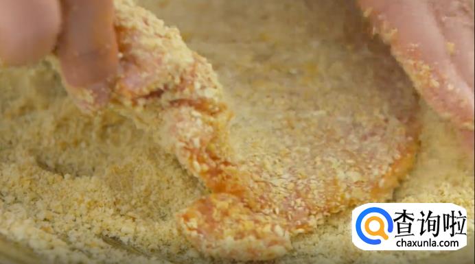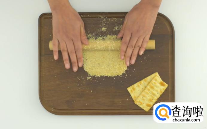 在腌制的时候,先来处理苏打饼干,将苏打饼干碾碎。等猪排腌制好之后,将猪排裹上饼干碎。