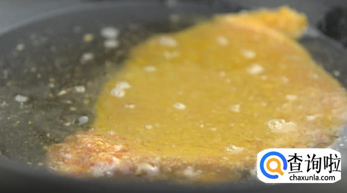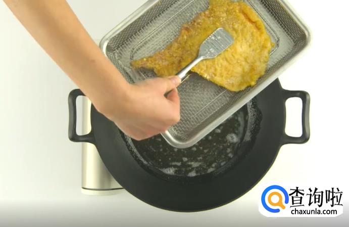接着,小火热油,油温烧至60度,把猪排放入进去,初炸定型,等到猪排略变色后取出来。