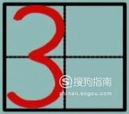 “3”起笔不碰线,向上碰线,再向下碰线,略成半圆向中间弯,在虚线以上转向右下方碰线,向下碰底线,最后,弯向上碰线。