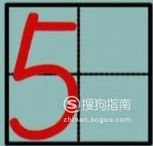 “5”从上线不到一半的地方起笔,向左下到中格角,再向上超过中线画一个大半圆碰右线,下线到左线为止。最后,在上面画一横线。