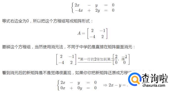 在初等数学方程组中都是有唯一解的,而在线性代数中,我们把这种情况称为方程组“系数矩阵的秩为1”,记为r(A)=1,当矩阵的秩小于未知数的个数时,方程组有无数个解;当矩阵的秩等于未知数的个数时,方程组只有零解。
