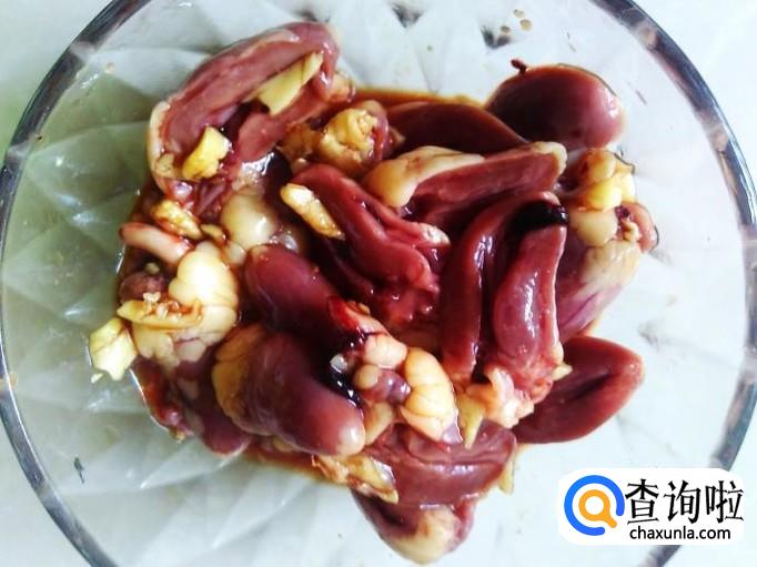 鸡心清洗干净,然后把每个鸡心切成两边,加适量的盐、姜蓉、生抽、料酒腌制几分钟。