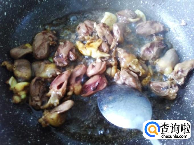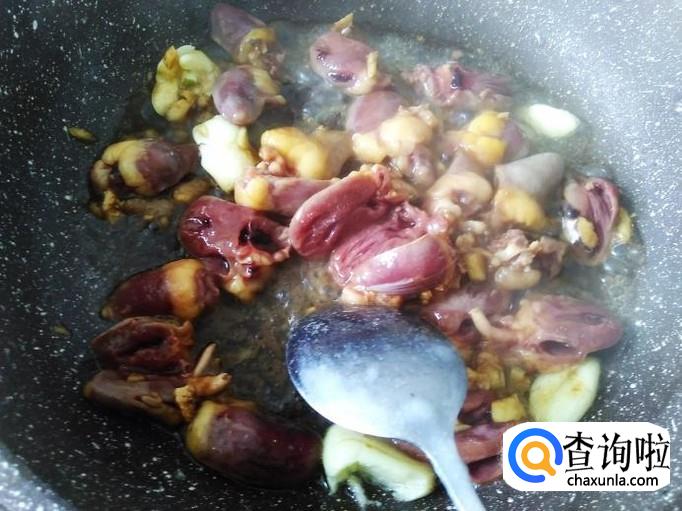 自做的酸芋苗150克,鸡心200克,姜蓉、蒜米适量,生抽1勺,料酒适量,自做的酸梅紫苏辣椒酱1勺。