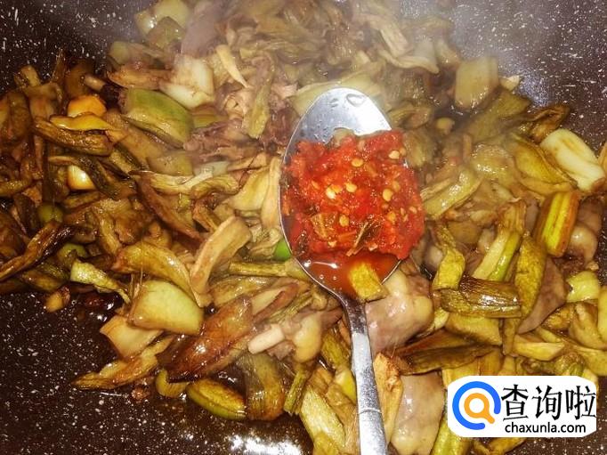 酸芋苗下锅,加1勺自做的辣椒酱进去。