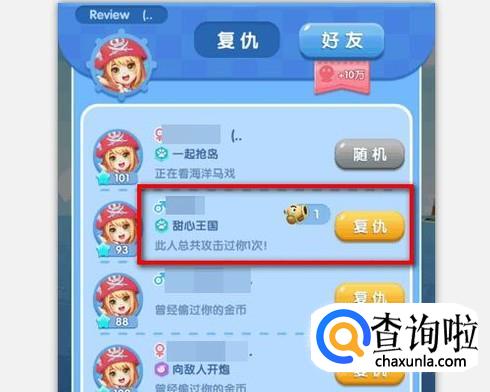 点击页面上方的【复仇】后,页面就会弹出所有攻击我们的岛主和盗取我们金币的人,选择其中一个人,点击【复仇】图标;