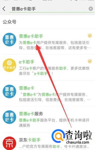 进入之后,搜索“普惠e卡助手”,点击并关注该公众号,如图所示。