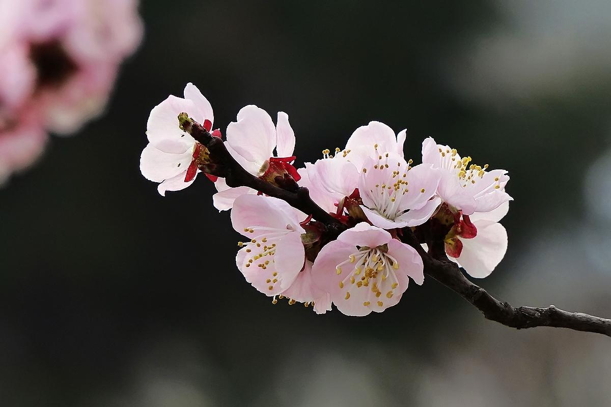 9、杏花的花瓣有四五片,花瓣润泽透明,像是用琥珀或玉石雕成的,很有点冰清玉洁的韵致。花蕊是嫩黄色的,就像一颗颗繁星正在向我调皮的眨着眼睛呢。