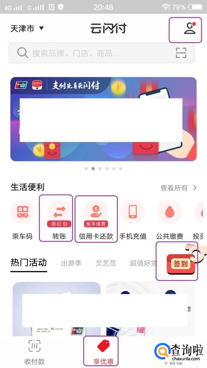 首先,我们打开云闪付app,在首页上我们看到,每天签到和转账都能领取小红包。