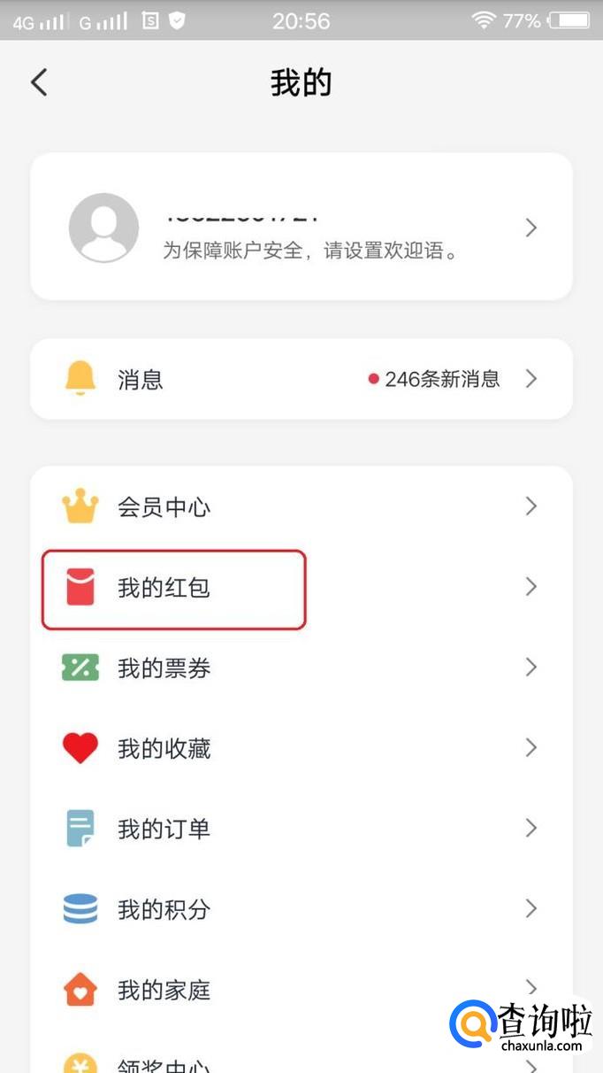 在首页上点击右上角头像,就可以查询“我的红包”金额。