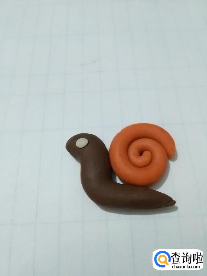 用白色橡皮泥团一个小圆球,粘在蜗牛头部,当做小蜗牛的眼睛。