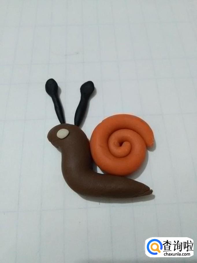 再用黑色搓两个小细条,末端用手捏成圆形,粘在蜗牛头部上方,当做两个触角,小蜗牛就做完了。