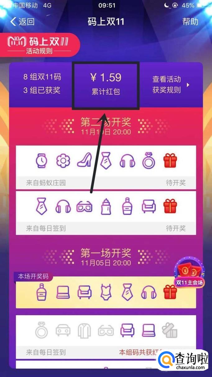 点击如下图,我们可以查询到我们攒码中了多少奖金?你学会了吗?赶快动手试一试吧。