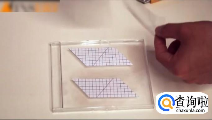 将CD盒沿纸的边缘裁下,裁出四块等腰梯形。