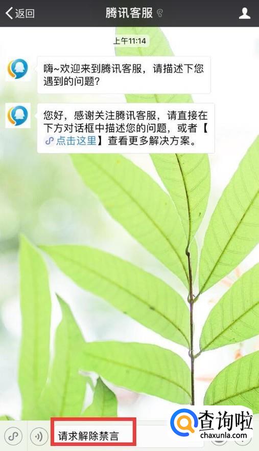 进入到腾讯客服公众号页面后输入“请求解除禁言”并发送。